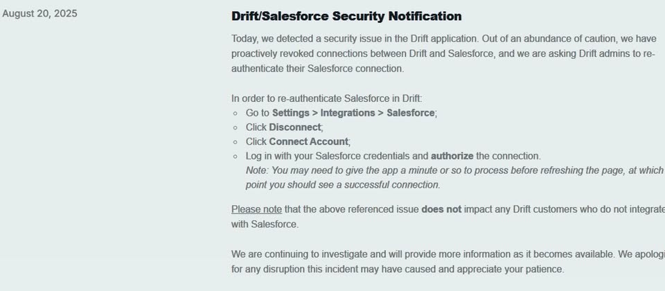 針對Salesloft旗下的對話行銷暨客戶互動平臺Drift傳出的供應鏈攻擊事故,駭客組織UNC6395自8月8日至18日,透過竊得的應用程式OAuth憑證(Token),成功存取並匯出多家企業的Salesforce資料,繼8月底資安業者Zscaler證實受害,本週又有兩家資安業者發布聲明,表示他們也面臨資料外洩的情況。