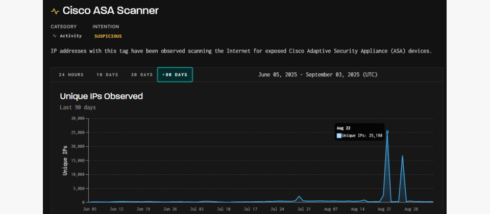 GreyNoise在8月26日觀察到2波對Cisco ASA裝置的掃描活動突然竄升。第一波牽涉超過2.5萬個不重覆IP,第二波是在隔幾日後,數量少一點,但屬相關聯活動。涉及這二波IP的數量大幅超越每日小於500個IP的基準線。