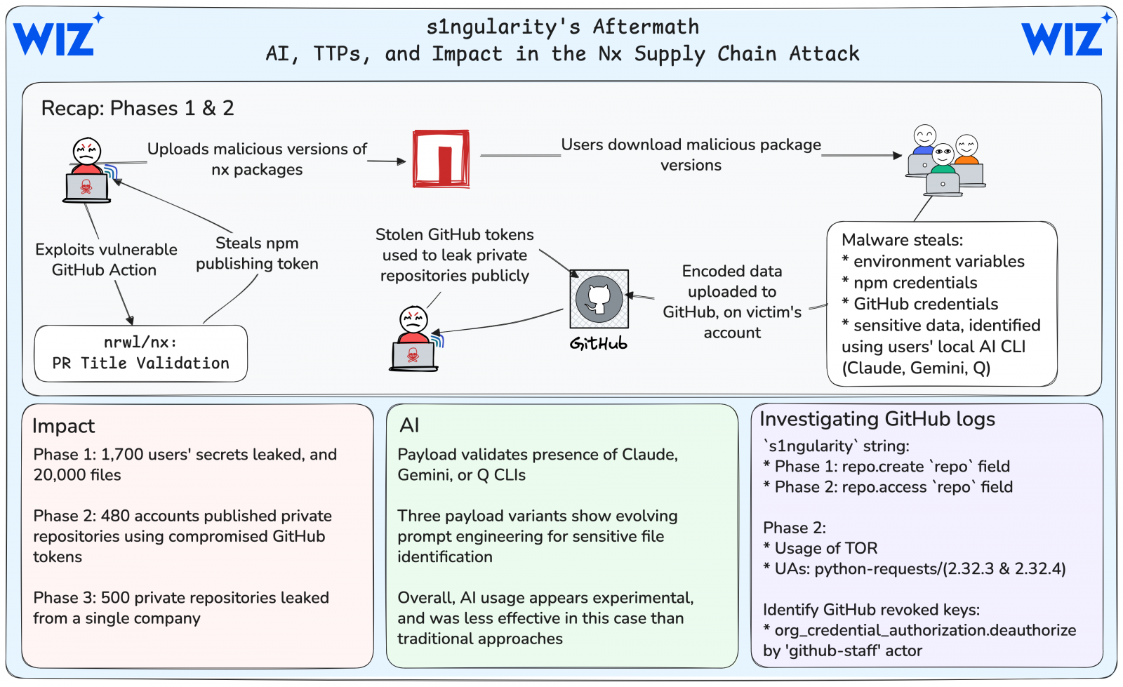事件起點是8月26日,攻擊者濫用GitHub Actions取得Nx套件的NPM發布權杖,釋出惡意版本。安裝後的程式會收集環境變數與憑證,再透過受害者本機的GitHub CLI建立名稱帶有s1ngularity-repository文字的公開儲存庫,以存放外洩資料。
