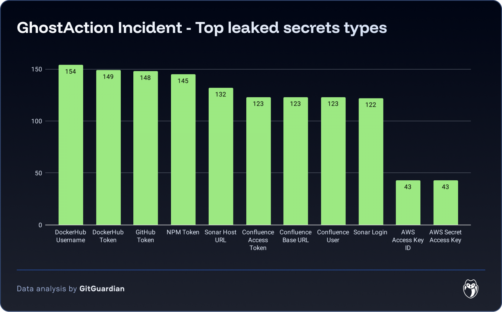 然而後續GitGuardian發現,這實際上是規模更大的攻擊活動,於是進一步根據特徵進行比對,結果找到327個受害的GitHub用戶,並確認有3,325組機敏資料外流,其中最大宗的是DockerHub用戶名稱及憑證,分別有154、149個,其次是GitHub、NPM的憑證,有148、145個,其餘還有Confluence的憑證、URL、使用者名稱,以及AWS存取金鑰與ID等。