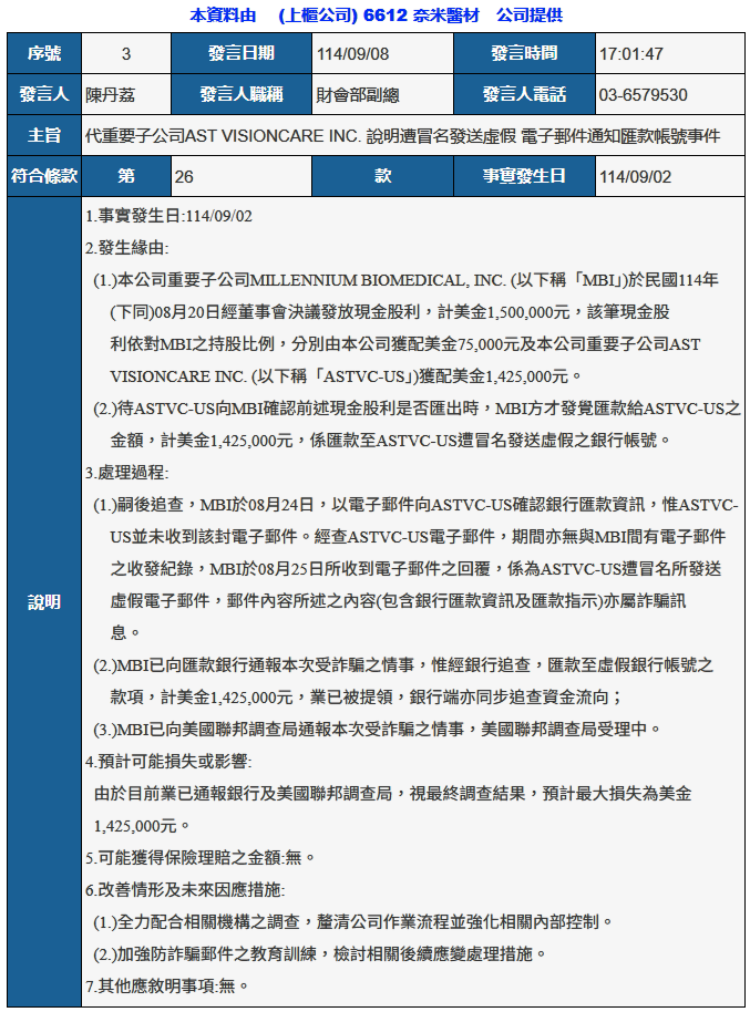 週一(9月8日)上櫃公司奈米醫材發布重訊,指出旗下的AST VisionCare Inc.(ASTVC-US)遭到歹徒冒名,向另一家子公司Millennium Biomedical, Inc.(MBI)寄送電子郵件並提供匯款帳號,導致MBI將原本要匯給ASTVC-US的款項,匯入歹徒的銀行帳號。