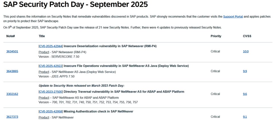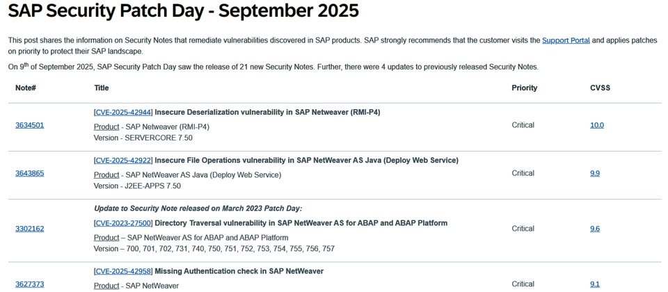 9月9日SAP發布本月例行更新(Security Patch Day),總共修補21項資安漏洞(上個月是15個),值得留意的是,當中包含3個危險程度達到重大層級的漏洞,其中1個達到滿分(10分)、1個接近滿分,相當危險。