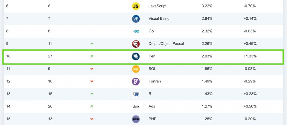 TIOBE 2025年9月程式語言流行度指數公布,Perl從1年前的第27名大幅上升至第10名,評分2.03%,成為本期最顯著的變動。TIOBE官方說明,名次提升與其在Amazon書籍數量有關,Perl相關書籍數量約為PHP的4倍、Rust的7倍,因此帶動評分增加。