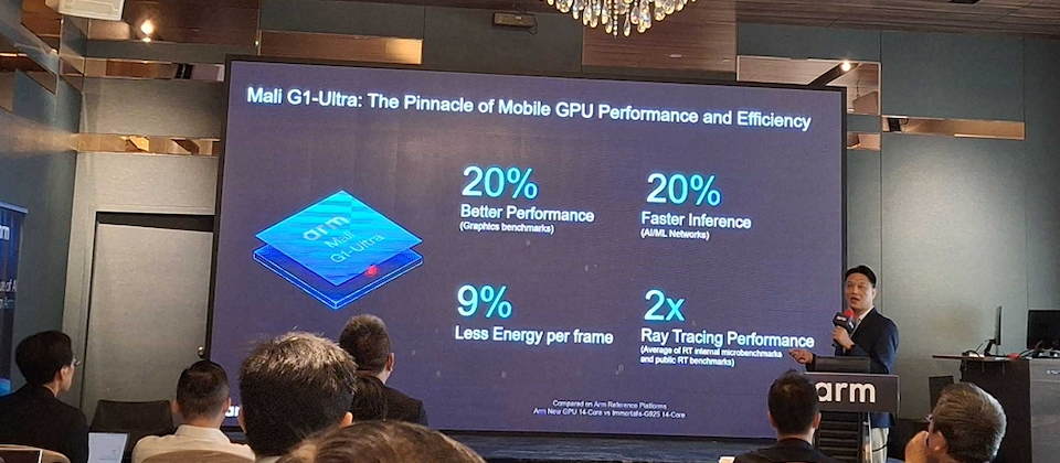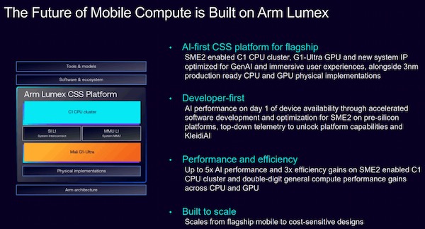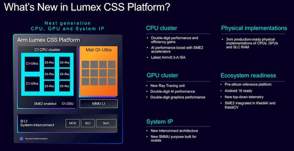 Lumex CSS目前針對3奈米製程最佳化實體實作,Lumex CSS包括採用SME2的Armv9.3 CPU叢集,還有宣稱提升2倍的光線追蹤效能的Arm Mali G1-Ultra GPU,以及DSU(Arm C1-DSU), KleidiAI函式庫。