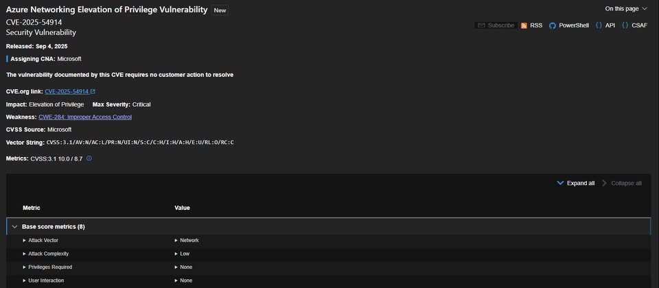 這項風險值滿分的資安漏洞是CVE-2025-54914,出現在Azure Networking,可被用於權限提升,為存取控制不當的弱點(CWE-284),並指出該漏洞CVSS評分達到10分,相當危險。微軟強調,使用者無須採用行動,他們記錄這個漏洞的主要目的,就是提供後續追蹤的透明度。