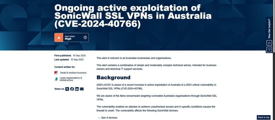 9月10日澳洲網路安全中心(ACSC)提出警告,他們掌握CVE-2024-40766在當地遭到積極利用的情況,Akira用來對SonicWall的SSL VPN系統下手,而有機會進行未經授權的存取,並在特定情況導致防火牆當機,呼籲用戶應儘速檢查SonicWall設備的使用情況,並根據廠商的公告及指引進行調查與補救。