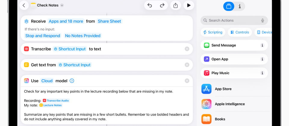 Shortcuts則是用來把多個操作流程串成一鍵執行的流程腳本,支援iOS、iPadOS與macOS。例如製作一個「Hold That Thought」的捷徑,它會截圖螢幕,儲存剪貼簿內容,匯出未來一小時的行事曆,以及將上述整理成一個提醒事項,之後在使用者臨時被打擾時就能執行它,以便事後可立即接續。也能設計成尋找家中物品或打包行李的助手。