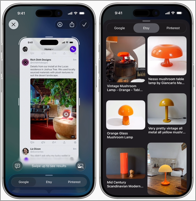 影像智慧則能理解螢幕內容,可用來搜尋相似圖片,詢問ChatGPT,摘要或翻譯文字,或是一鍵加入行事曆。Genmoji及影像樂園便是用來生成全新的表情符號或是風格化圖像。Workout Buddy可用來分析使用者的體能訓練資料及健身紀錄,同時根據心率、配速、距離、活動紀錄或個人健身里程碑等資料,於運動過程中提供個人化的語音激勵內容;不過,它初期只有英文。
