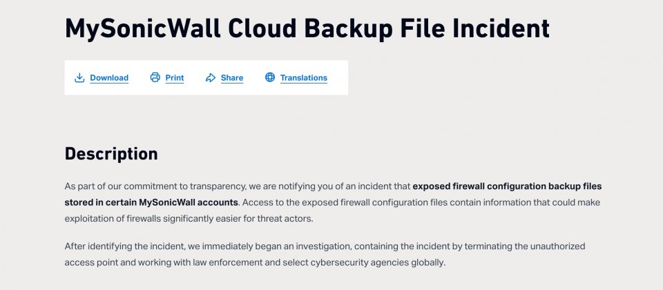 SonicWall通知其用戶在MySonicWall帳號中儲存的防火牆雲端設定檔備份,曾遭未經授權的存取,這些檔案包含密碼、金鑰與其他敏感資訊,要是落入攻擊者手中,可能降低滲透防火牆的難度。SonicWall表示,事件發現後已關閉未授權的存取點,並與國際執法及資安單位展開調查,同時要求受影響的使用者立即執行隔離與憑證重設。