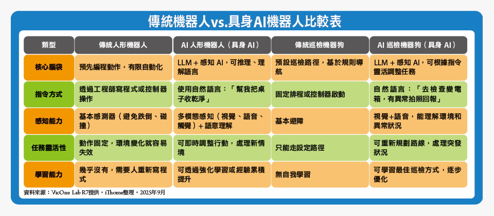 傳統機器人就像是機械動作的「工具」,腦袋是「寫死的程式」;具身AI機器人,則是會聽懂、會判斷、能學習的「智慧助手」,腦袋是「能理解語言、推理、學習的AI。