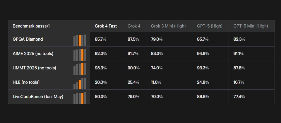 xAI表示,過去推理模式(長鏈思考)與非推理模式(快速回應)通常需要不同模型,但Grok 4 Fast採用了統一架構,讓同一組模型參數同時處理兩種需求,並能透過系統提示來調整模型行為,降低端對端的延遲,也會減少Token的使用。