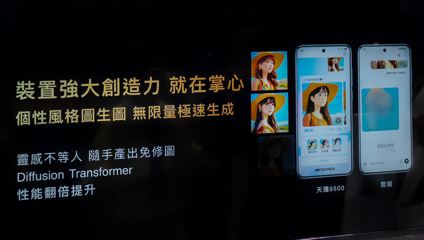 在裝置端AI方面,內建的NPU990,在AI效能最高提升111%,提升大型語言模型在AI摘要的輸出能力,以及多模態的理解能力,並且可生成4K圖片。聯發科也大力鼓吹裝置端AI的好處,例如企業內部的重要會議,利用裝置端AI來產生紀錄、摘要,避免使用雲端AI導致資料外洩的風險;此外,當使用者在飛機上或是國外旅行等行動網路受限的場合,不需連接網路,手機端就能執行AI應用。