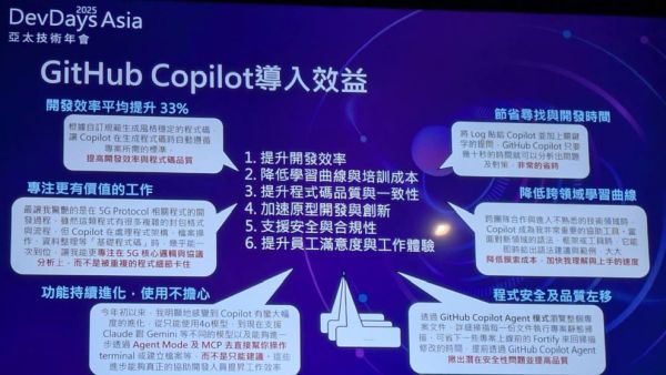 另一個效益是,當開發人員要執行跨領域專案,需使用較陌生領域的語言進行開發,開發人員和AI協作,由AI針對新領域提供建議及範例,降低跨領域的學習曲線。而對於新進員工,通過AI的輔助降低新進員工的摸索成本、縮短上手的時間。