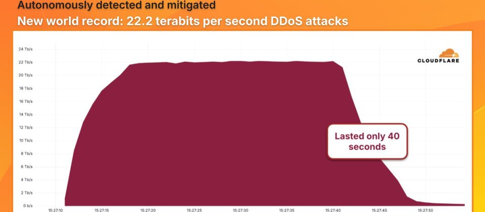 9月23日Cloudflare於社群網站X(原推特)發文指出,他們再度成功偵測並緩解大規模DDoS攻擊,流量尖峰值達到22.2 Tbps、10.6 Bpps,這次活動時間為期約40秒。不過,對於攻擊的類型與流量來源,該公司並未進一步說明。