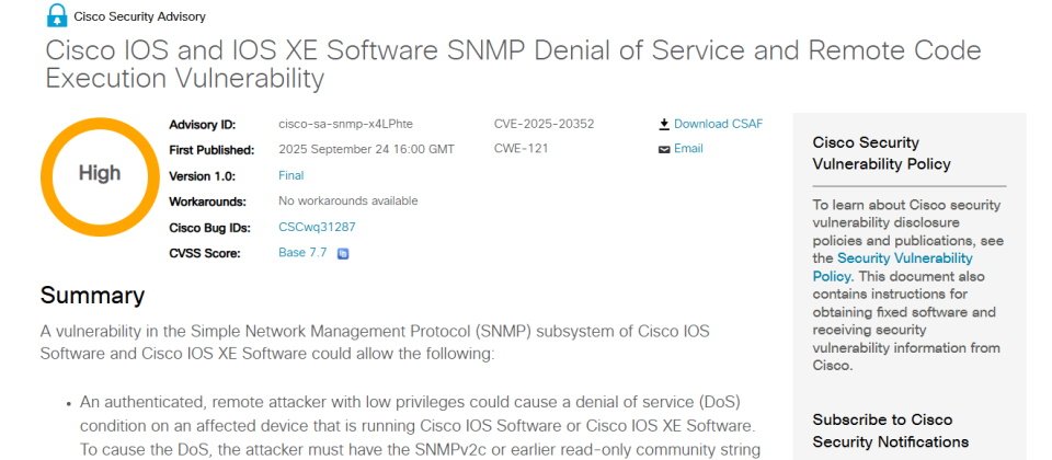 遭到攻擊的漏洞編號CVE-2025-20352,它是位於Cisco IOS及IOS XE軟體的簡單網路管理協定(Simple Network Management Protocol,SNMP)子系統。攻擊者可以由IPv4或IPv6網路傳送惡意SNMP封包來濫用漏洞。CVE-2025-20352風險值為7.7,屬高風險。