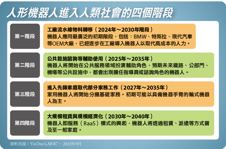 根據VicOne的研究,人形機器人將分成四個階段進入人類社會,他們也預測了人形機器人部署藍圖:「人形機器人會以工廠部署、公共服務、初階家務、租賃與進階家務的階段進入人類社會」。