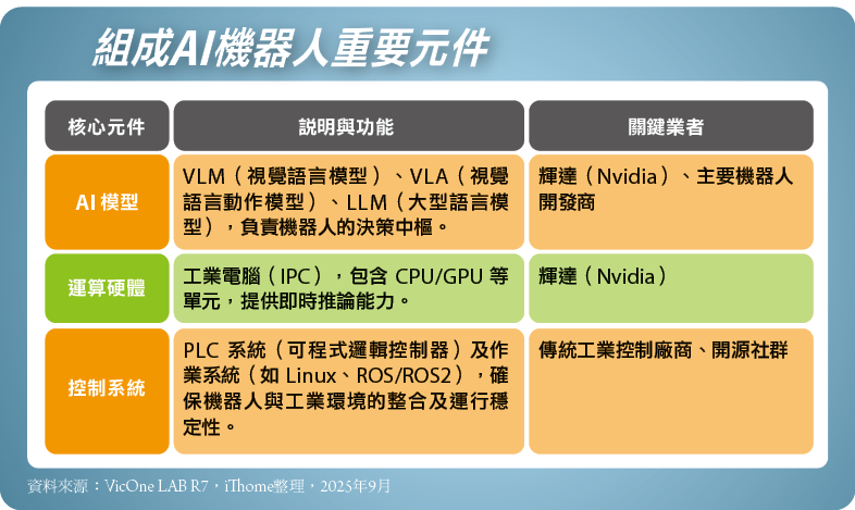 具身AI機器人的核心競爭力在於其「大腦」系統。這套系統賦予機器人感知、推理並採取行動的能力,是實現「物理AI」的關鍵。目前,具身AI的完整架構包括:AI模型(VLM/VLA/LLM)、工業電腦(IPC,如CPU/GPU)、PLC系統與作業系統(如Linux、ROS/ROS2);其中,AI模型扮演機器人決策的核心角色。