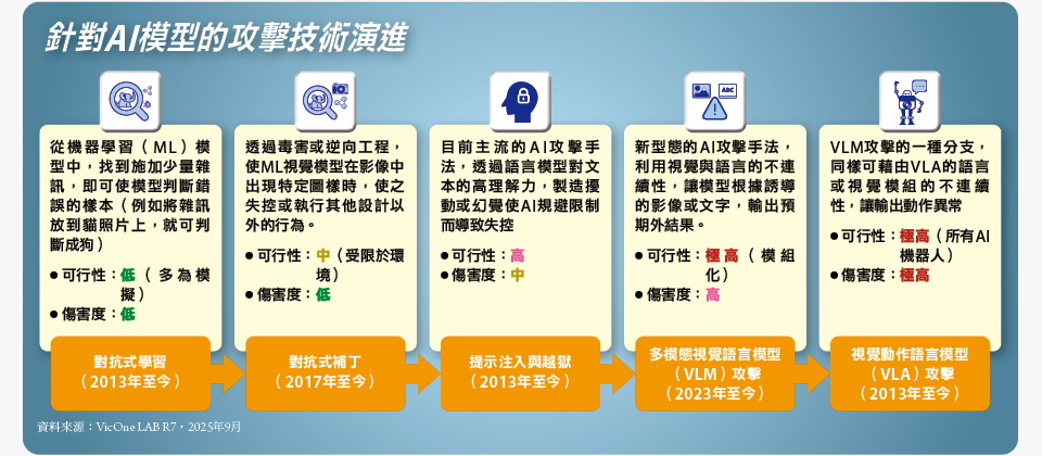 而且,結合視覺、語言與動作的VLA(Visual-Language-Action)的AI模型,已迅速應用於機器人與自動化系統,但也因此出現三種新的攻擊向量。
