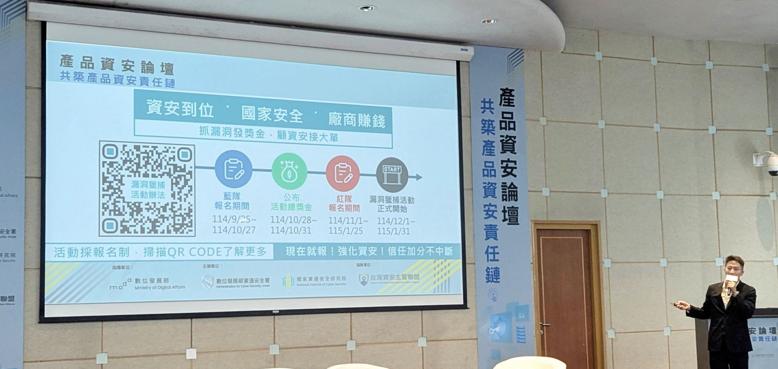 根據現場公布資料顯示,活動正式開始時間為12月1日到明年1月31日。報名分兩階段,現在已經開始,藍隊(電子產品製造品牌廠商)報名期間將9月25日到10月27日,接下來會揭曉活動獎金,紅隊(白帽駭客與資安專業人員)報名期間從11月1日開始。資安院檢測防禦中心總監劉建良表示,這是資安院第一次舉辦,目前先聚焦電子產品製造品牌廠商,之後舉辦將納入軟體開發業者。