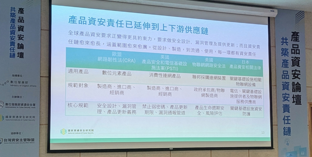 「產品的資安防護不再是附加選項,而是產品設計的核心要求。」身為資通訊產品重鎮的臺灣,需關注此一重大變化,了解確保產品安全已是大勢所趨。