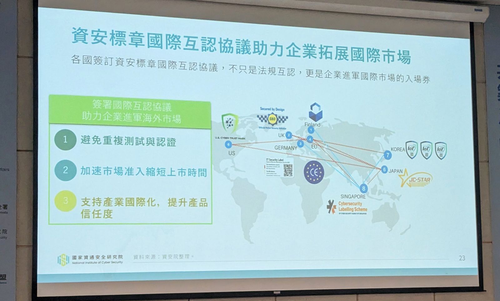 畢竟,產品安全議題從一年半前開始有大幅變化,當時國際已有相當多行動展開,包括:歐盟網路韌性法(CRA)、英國PSTI法案發布,還有美國推動US Cyber Trust Mark安全標章,美CISA公布Secure by Design系列警報,以及南韓與新加坡簽署物聯網安全認證體系MOU等消息。