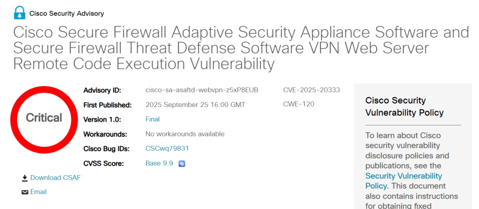 其中CVE-2025-20333存在VPN Web Server軟體。它出於使用者HTTP請求輸入驗證不足,使具有有效VPN憑證的攻擊者可傳送改造的HTTP請求來濫用漏洞。成功濫用的攻擊者能在受害系統上以root權限執行任意程式碼,導致完全接管受害裝置。漏洞風險值高達9.9。