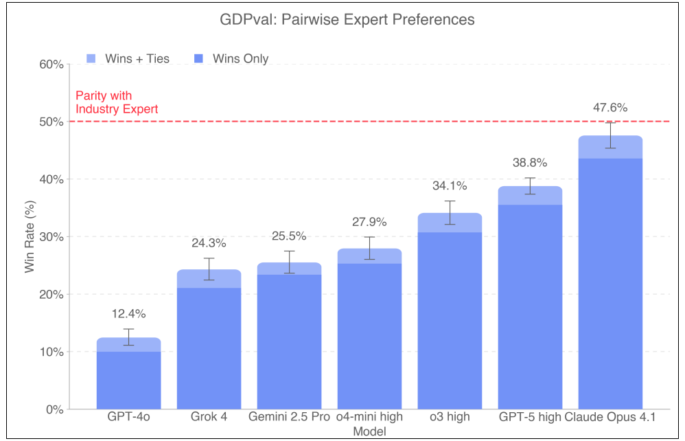 OpenAI在GDPval評估中測試了多個尖端AI模型,包括自家的GPT-4o、o4-mini、OpenAI o3與旗艦級的GPT-5,以及其他主要廠商的模型,如Anthropic的Claude Opus 4.1、Google DeepMind的Gemini 2.5 Pro,與xAI的Grok 4。