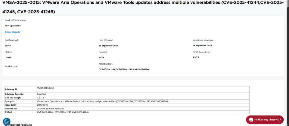 9月29日VMware針對旗下的Aria Operations與VMware Tools發布更新,修補資安漏洞CVE-2025-41244、CVE-2025-41245、CVE-2025-41246,其中,通報CVE-2025-41244的資安業者指出,中國駭客UNC5174將其用於實際攻擊,最早可追溯到去年10月中旬。