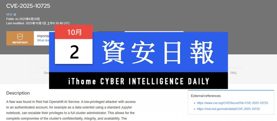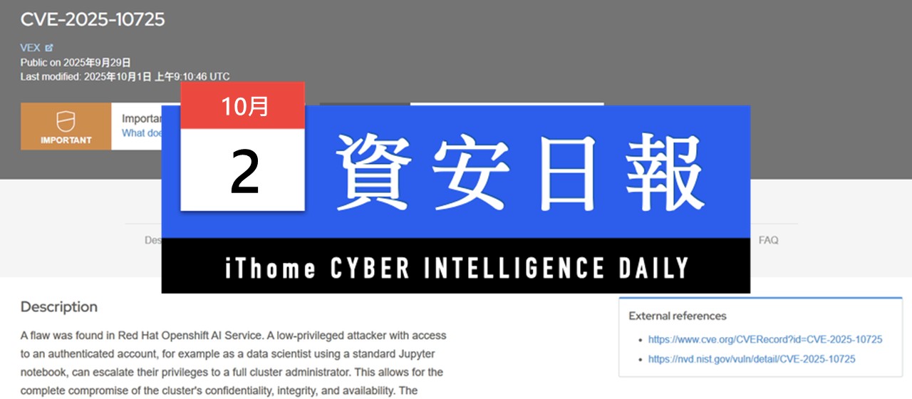 9月29日Red Hat發布資安公告,為旗下人工智慧平臺OpenShift AI修補CVE-2025-10725,由於其CVSS分數評為9.9分(滿分10分),相當危險,若不處理攻擊者有機會用於提升權限,進而在特定情況下掌控整個基礎設施。