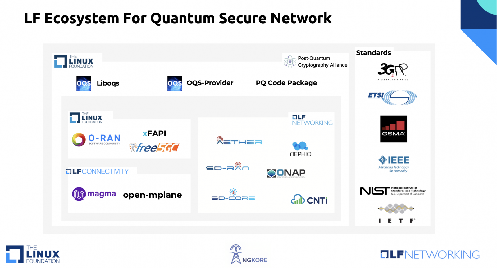 Linux基金會後量子加密聯盟技術諮詢委員會副主席Aditya Koranga將free5GC列入量子安全網路的Linux生態系成員之一,想要結合電信技術和後量子加密,來發展一個具備量子安全等級的核心網路。(圖片來源/Linux基金會)