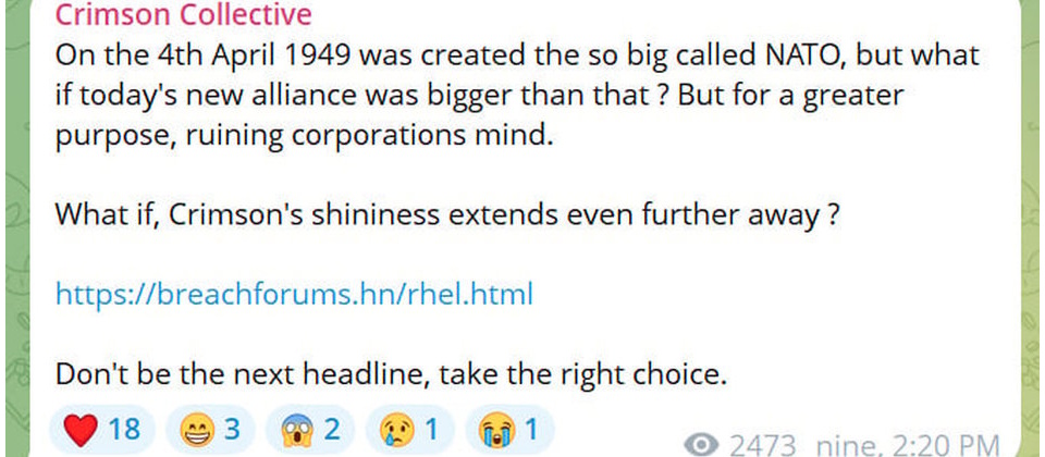 根據資安新聞網站Bleeping Computer報導,10月5日Crimson Collective在Telegram頻道上宣布,將與駭客組織Scattered Lapsus$ Hunters進行合作,號稱他們組成的聯盟,規模比1949年成立的北約組織(NATO)還要大。