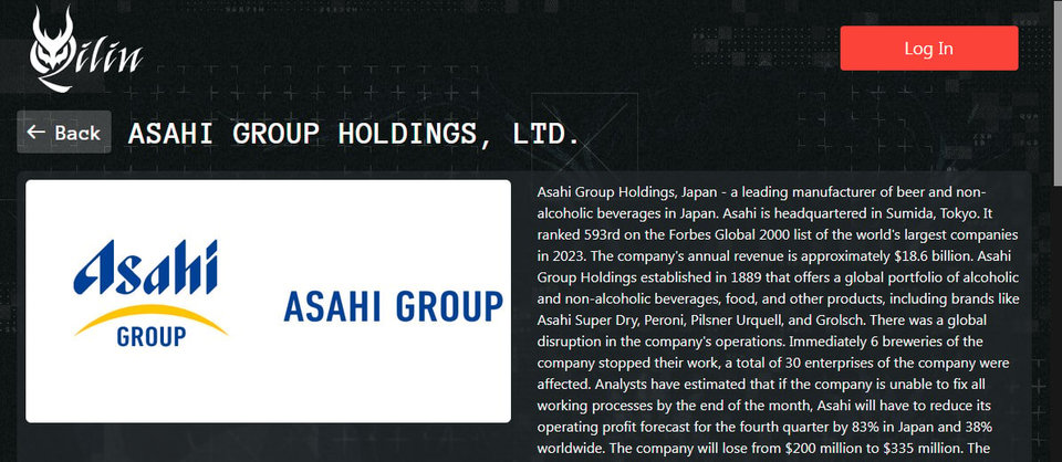 根據資安新聞網站Bleeping Computer的報導,勒索軟體駭客Qilin聲稱是他們所為,將朝日集團控股公司列於資料外洩網站,他們竊得27 GB資料,總共有超過9,300個檔案,為了取信買家,他們公布29張螢幕截圖,內含公司財務文件、員工編號、機密合約,以及內部報告。Qilin還揚言這起事故導致朝日6座啤酒廠生產中斷、影響旗下30個品牌,恐損失3.35億美元。對此,該新聞網站試圖取得朝日的說法,該公司拒絕評論,但透露他們恢復的情形。
