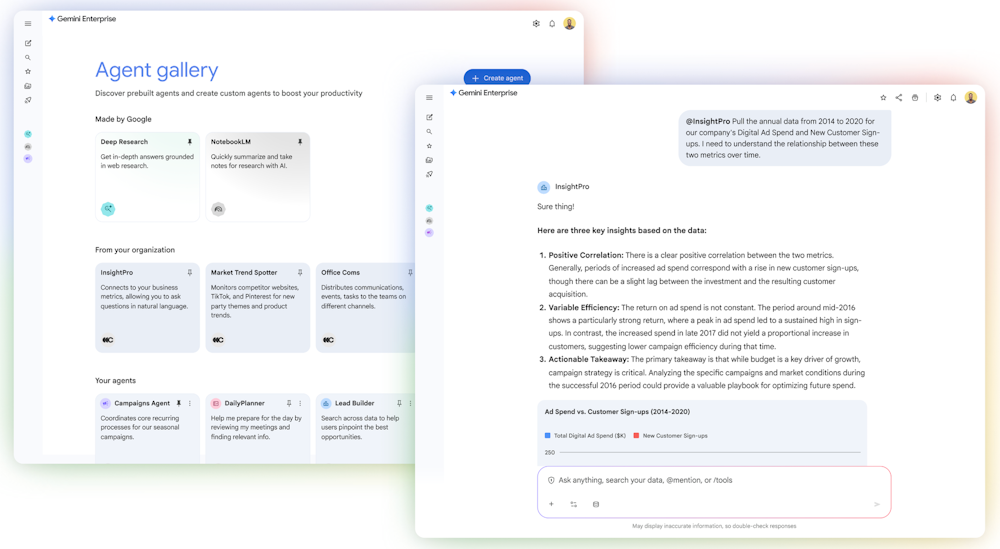 Gemini Enterprise是在Google Cloud基礎上發展出的新平臺服務,但是不同於Gemini for Google Workspace Enterprise/Business,Gemini Enterprise是以Gemini模型及Gemini-based代理人,而非文件、試算表、簡報檔應用為主體的企業平臺。