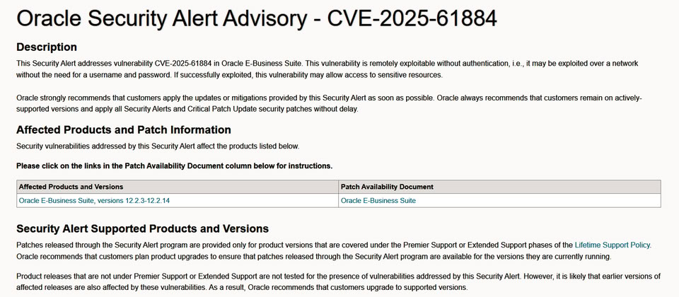 CVE-2025-61884出現在EBS的Runtime UI元件,影響12.2.3至12.2.14版EBS,CVSS風險為7.5分。這項漏洞相當容易利用,未經授權的攻擊者只需透過HTTP進行網路存取,就有機會以此滲透Oracle Configurator。一旦成功利用漏洞發動攻擊,攻擊者就有機會未經授權存取重要資料,或是完全存取Oracle Configurator能夠存取的所有資料。