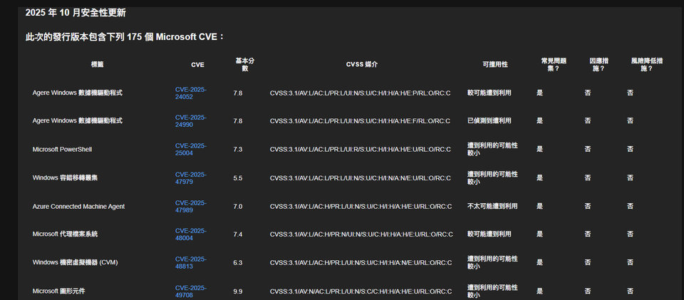 值得留意的是,這次微軟修補的漏洞裡,有6個是零時差漏洞,其中有3個CVE-2025-24990、CVE-2025-47827、CVE-2025-59230,已被用於實際攻擊行動。