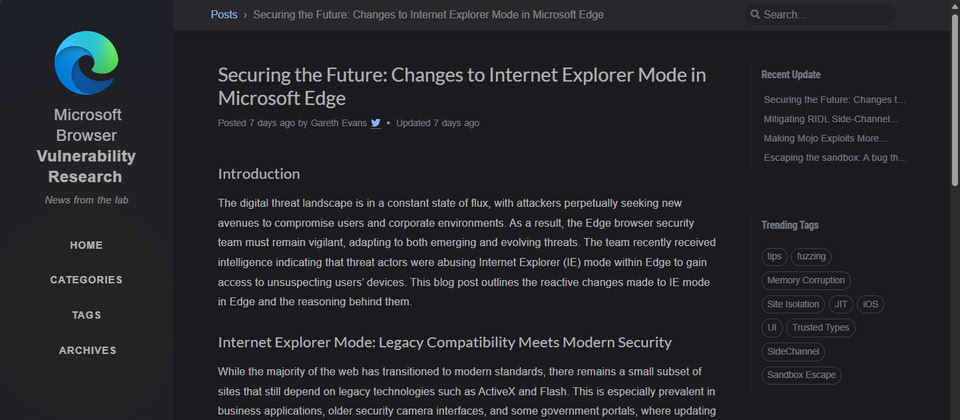 2022年6月微軟正式終止支援Internet Explorer(IE),並呼籲用戶改用Edge,但提供IE相容模式至2029年。然而駭客無所不用其極,企圖濫用相容模式的相關元件從事攻擊,最近微軟再度調整IE模式的運作機制,原因就是駭客再度針對這款已終止支援的瀏覽器下手,觸發零時差漏洞來接管裝置。