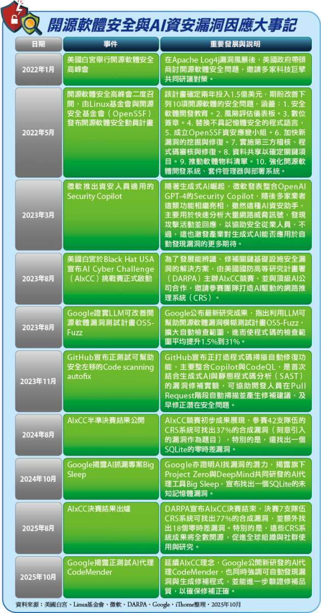 隨著時間與技術的演進,近兩年,無論AIxCC挑戰賽或各大科技廠的新成果,都突顯AI能發揮作用,守護關鍵基礎設施所倚賴的開源軟體。
