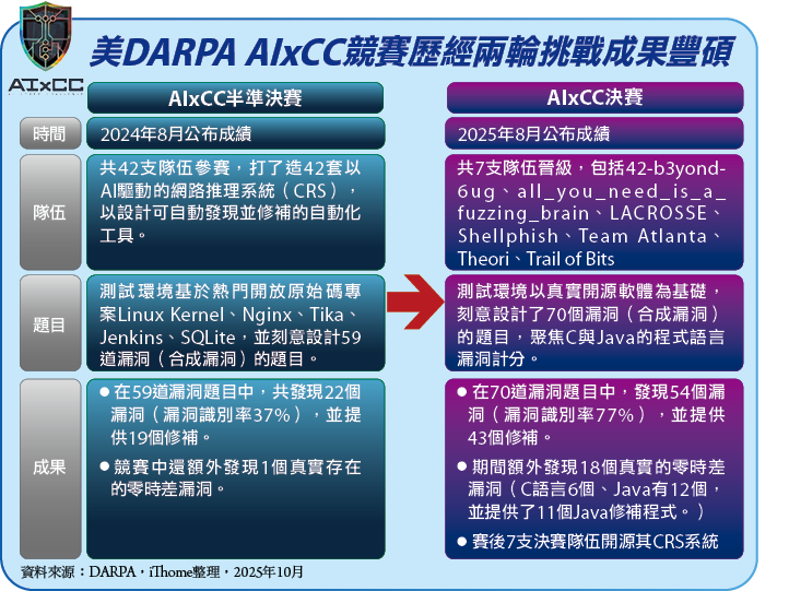 另一最受全球關注的消息是,2023年美國白宮宣布,由國防高等研究計畫署(DARPA)主辦「AI網路挑戰賽」(AIxCC),這項為期兩年的計畫獲得多家AI大廠技術支援,並且去年就有參賽團隊額外發現零時差漏洞,今年決賽更是額外識別出18個零時差漏洞。