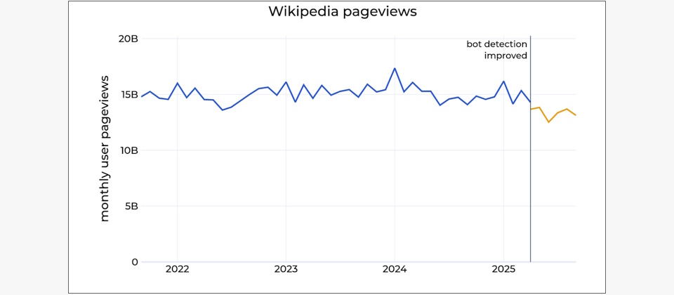 約莫在今年5月,他們觀察到異常高的人類流量,且主要來自巴西,促使他們展開調查並更新機器人偵測系統,接著再採用新的邏輯重新分類今年3~8月的流量,發現5、6月的流量異常很大一部分是來自於為了逃避偵測而建置的機器人程式。且在修改之後,顯示出維基百科在過去幾個月的人類流量明顯下滑,與2024年同期相較約下滑了8%。
