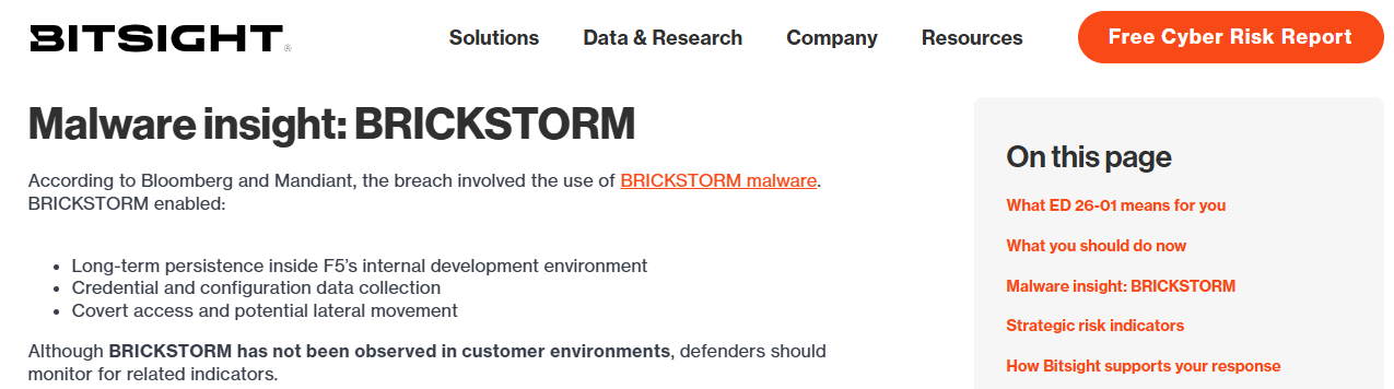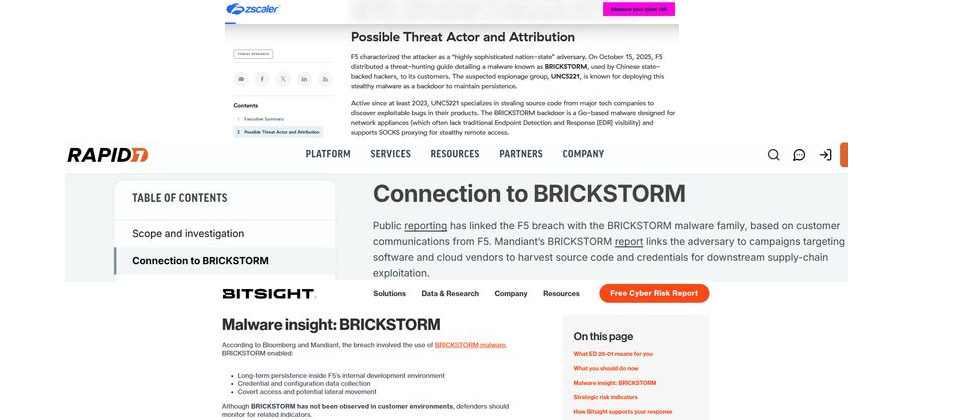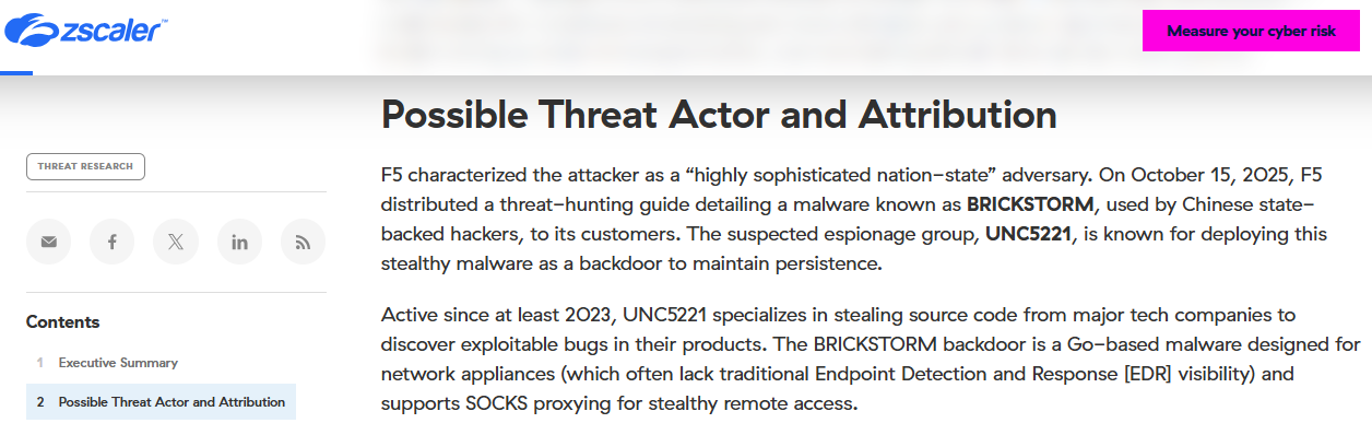 然而,發動這場攻擊的團體到底是誰?根據10月16日彭博社報導,F5在10月15日當天對用戶寄送關於惡意軟體Brickstorm的威脅獵捕指南,而Brickstorm是中國政府資助的駭客團體所使用的工具,該文也引用Google威脅情報小組(GTIG)與事故應變單位Mandiant今年稍早發布的調查報告,指出Brickstorm行動的幕後黑手是與中國有關的間諜攻擊組織UNC5221,以竊取熱門科技廠商的程式原始碼而聞名,目的是為了蒐羅軟體臭蟲,再用這些資訊侵入廠商的客戶,這個組織從2023年開始鎖定多個組織發動攻擊,在許多案例當中,駭入受害者環境的平均潛伏時間長達393天。