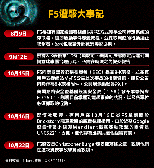 以應用程式遞送控制器(ADC)、網站應用程式防火牆(WAF)等產品著稱的F5,近年來積極發展網站應用與API防護(WAAP),本月15日該公司突然發布公告坦承8月察覺遭到國家級駭客侵入,震撼全球IT業界。該公司表示,攻擊者長期持續存取與下載該公司主要產品BIG-IP的研發環境,以及工程知識管理平臺,遭外流的檔案包含部分BIG-IP原始碼,以及尚未揭露且正在處理的資安漏洞資料,還有知識管理平臺的一些檔案,當中有少數客戶的組態設定或建置資訊。