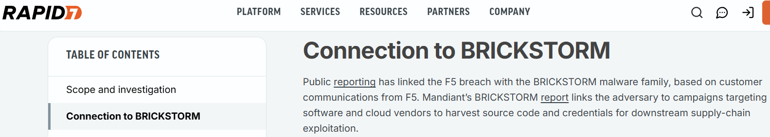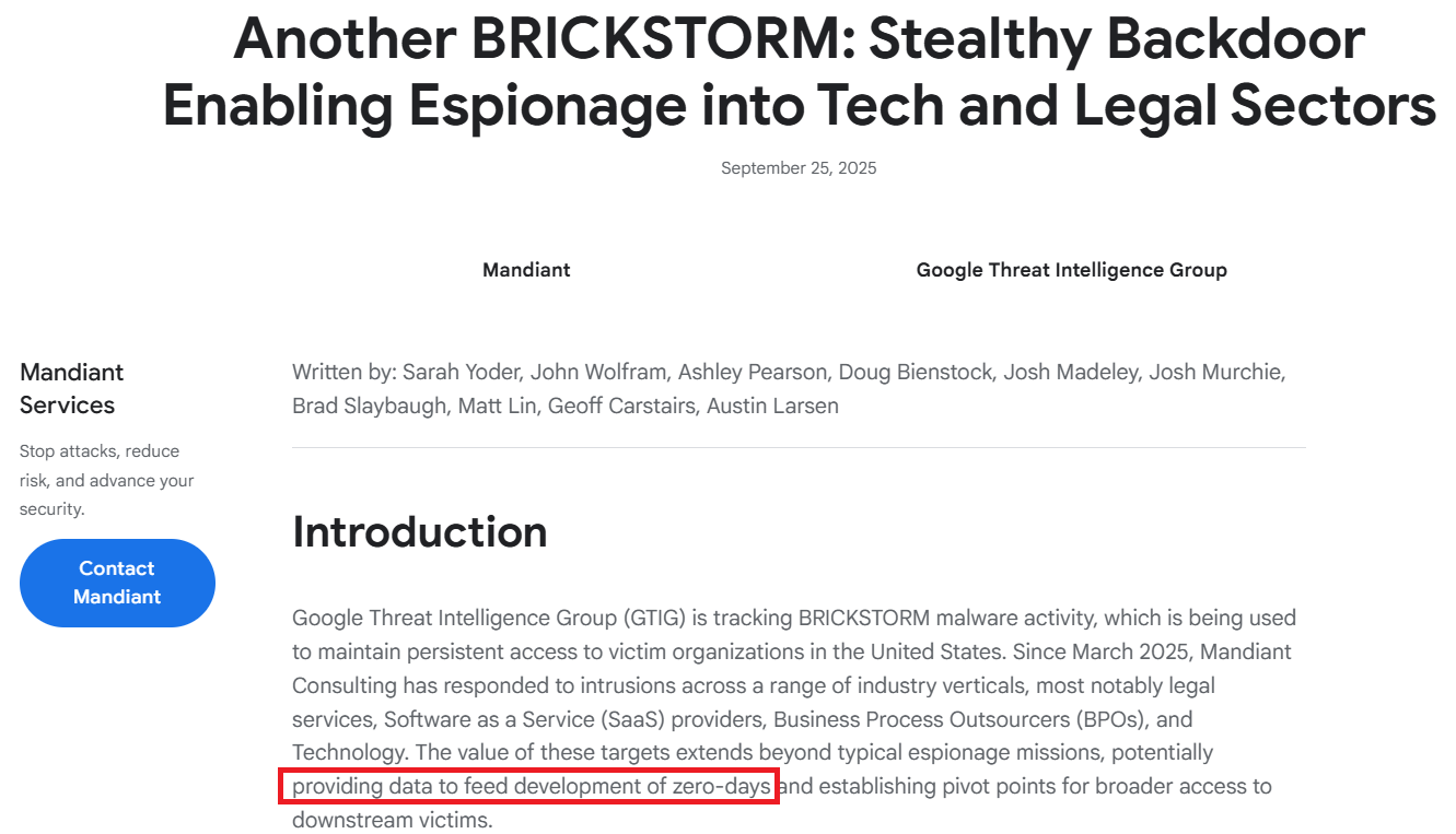關於竊取廠商程式碼、研究漏洞的說法,有可能來自9月Brickstorm行動的資安新聞報導,SecurityWeek曾引述Mandiant技術長Charles Carmakal的說明,當中提到這項認定。他表示,攻擊者竊取專屬程式原始碼,以及其他與企業資訊科技相關的智慧財產,因此,他們認為攻擊者正在分析竊取的程式原始碼,目的是尋找瑕疵與零時差漏洞,以便濫用多款企業資訊科技產品的弱點。