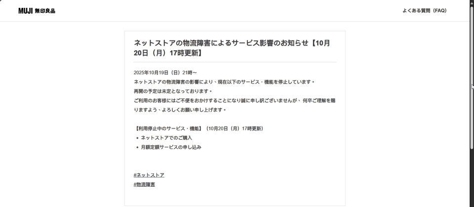 這起事故的傳出,源自於10月19日晚間日本生活用品零售製造商無印良品的一則公告,該公司網路商店物流業務出現異常,暫停部分服務和功能,且後續重新開放的時間仍未確定。事隔一天,無印良品又更新公告內容,說明暫停服務的範圍,包括:從網路商店下單,以及申請月費定額購買(編按:可能指的是訂閱制購買)服務。