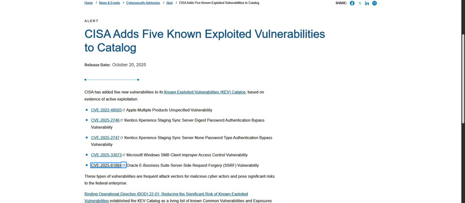20日美國網路安全暨基礎設施安全局(CISA)發布公告,將5個資安漏洞列入已遭到利用的漏洞列表(KEV),其中一個就是CVE-2025-61884,CISA要求聯邦機構必須在11月10日前完成修補。