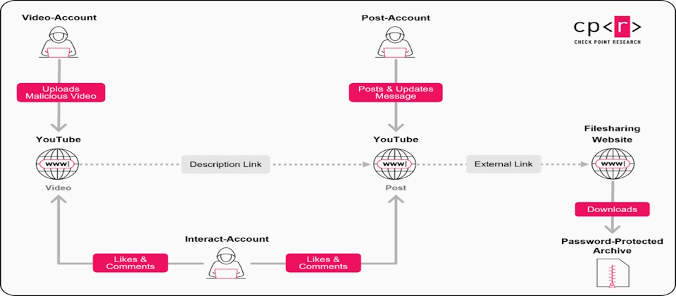 調查顯示,大部分的惡意影片來自於被盜的帳號或是大量新建的假帳號,駭客在這些帳號上傳破解軟體或遊戲外掛的教學影片,再於影片下方的內容描述、留言板或頻道裡的社群功能嵌入短連結,將使用者導向Dropbox/MediaFire/Google Drive或Google Sites等外部頁面,還會附上密碼以繞過自動掃描。