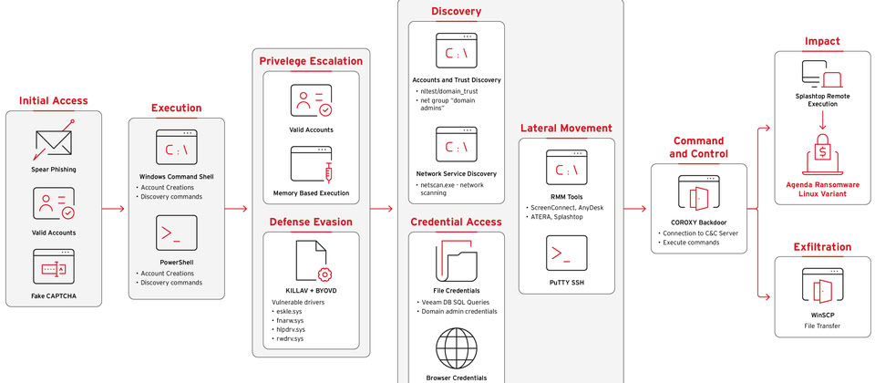 在完全控制受害電腦後,Qilin對整個網路環境進行偵察,過程中運用遠端管理工具ScreenConnect與網路掃描工具NetScan來進行。同時,這些駭客也使用IT管理平臺Atera來部署AnyDesk,目的是建立備援的遠端存取機制。