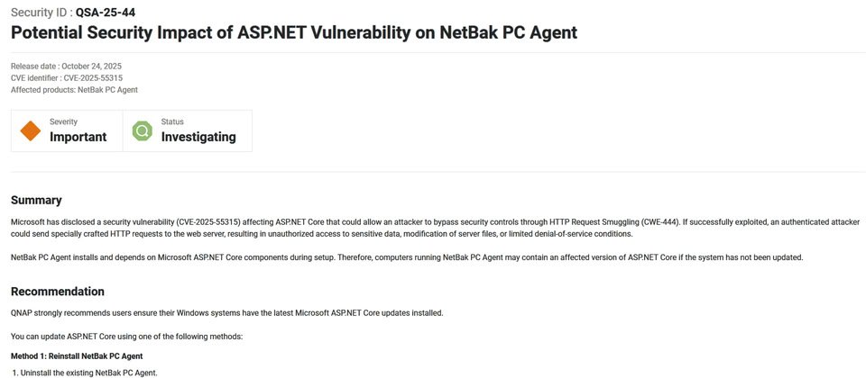 10月24日臺灣NAS廠商威聯通(QNAP)發布資安公告,由於公用程式NetBak PC Agent須搭配ASP.NET Core元件才能運作,受到CVE-2025-55315的影響,若NetBak PC Agent用戶未更新該元件,有可能會面臨CVE-2025-55315帶來的資安風險,因此,他們呼籲用戶儘速處理。這支威聯通提供的代理程式,主要用途是讓用戶將Windows電腦或伺服器的資料備份到NAS設備。