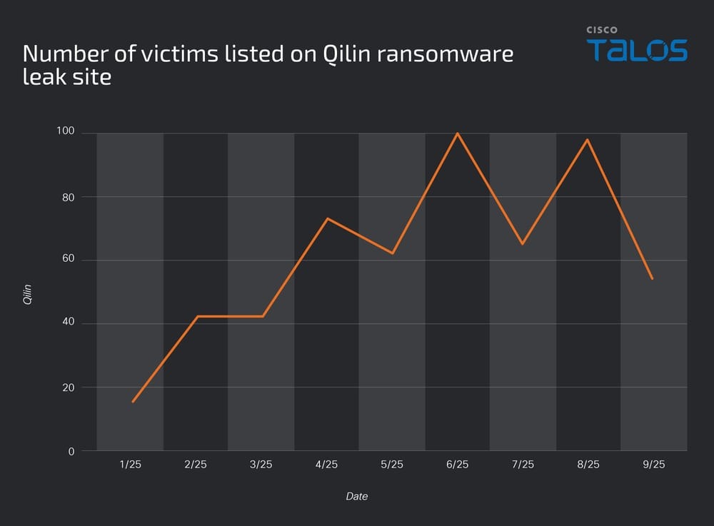 思科威脅情報團隊Talos指出,Qilin在今年6月與8月公布的受害企業組織數量達到高峰,這兩個月攻擊者都聲稱有接近100家遭駭,不過,即使是其他月份,幾乎都有超過40家受害,這樣的情況使其成為全球最具威脅的勒索軟體。從受害組織的產業類型來看,製造業接近四分之一(23%)最嚴重,其次是專業與技術服務,以及批發貿易,分別占18%與10%。