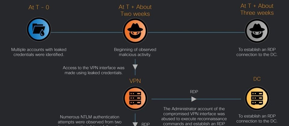 駭客從哪些管道入侵受害組織?Talos表示可能是透過暗網取得的外流管理員帳密,來存取受害組織的VPN,然後試圖竄改AD的群組原則物件(GPO)從而能夠利用遠端桌面連線(RDP)存取受害組織的網路環境。在其中一起事故裡,受害組織的VPN並未設置多因素驗證(MFA),使得駭客只要取得相關帳密,就能不受限制存取網路環境。