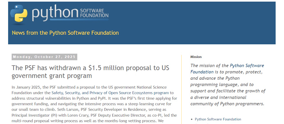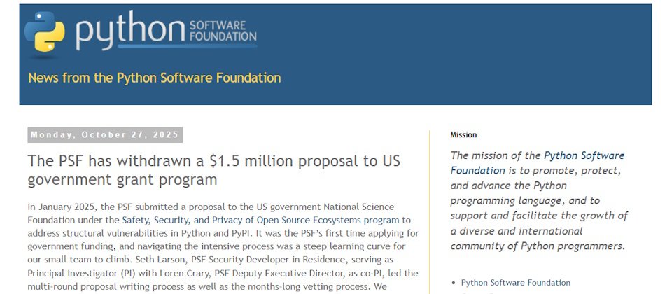 Python軟體基金會(Python Software Foundation,PSF)本周揭露,該基金會原本已通過美國政府國家科學基金會(National Science Foundation,NSF)針對開源系統所提供150萬美元安全補助專案,卻因該專案要求它們在獲得補助的期間,不得推動任何歧視性的平等意識型態(Discriminatory Equity Ideology,DEI)計畫,而決定退出該專案。